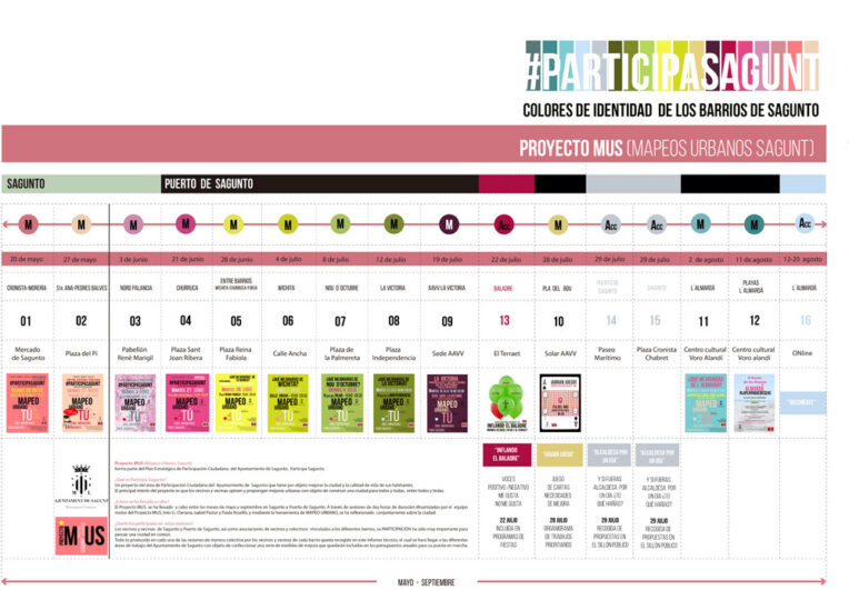 El Proyecto MUS se llevó a cabo entre los meses de mayo y septiembre del 2016 en Sagunto y Puerto de Sagunto. A través de sesiones de dos horas de duración dinamizadas por el equipo motor del Proyecto MUS, Inés G. Clariana, Isabel Pastor y Paula Roselló, y mediante la herramienta de MAPEO URBANO, se reflexionó conjuntamente sobre la ciudad.