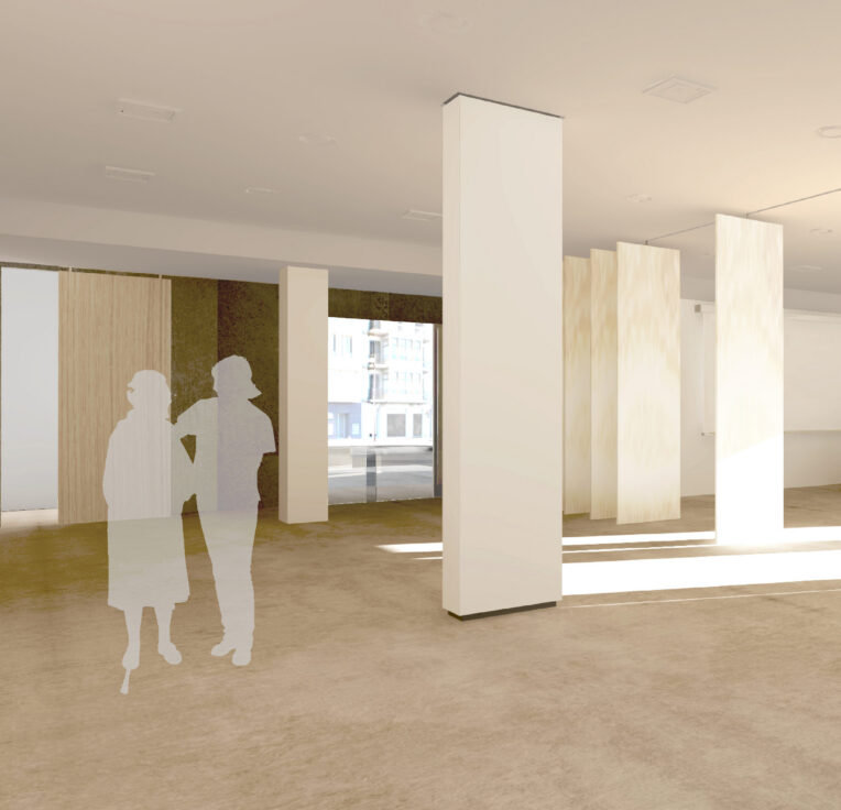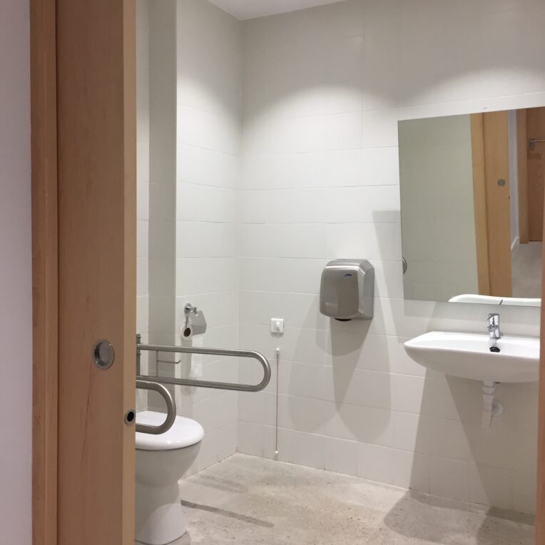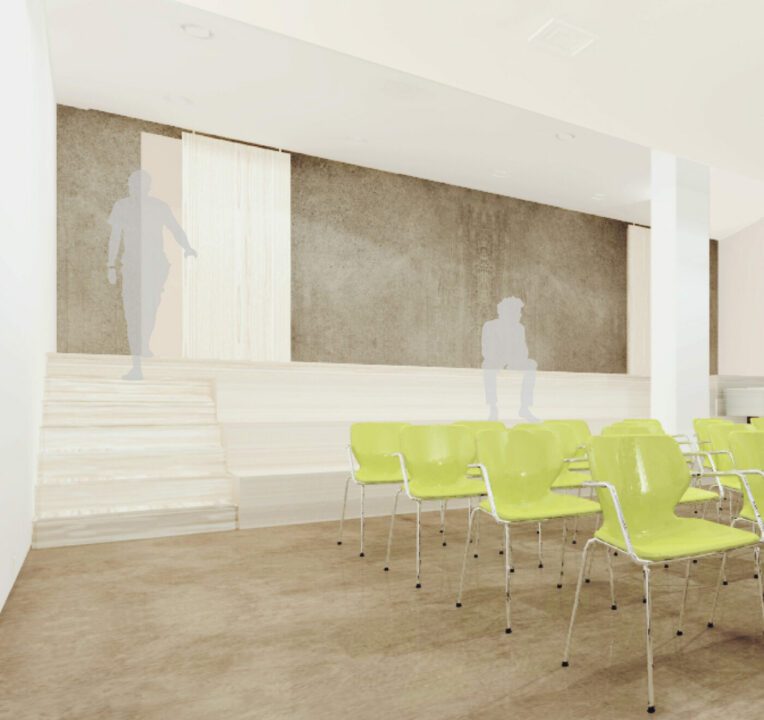 La entreplanta del fondo del local sobre entrada de garaje de zaguán contiguo, con una altura de +1,69m, se resuelve mediante un pequeño anfiteatro interior que permite la transición entre las distintas cotas creando un espacio útil en el que se pueden realizar diversas actividades, además de interesante arquitectónicamente hablando. Este espacio contará con una plataforma elevadora para permitir la accesibilidad universal.